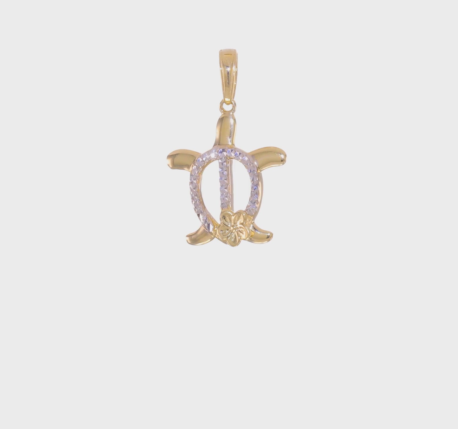 14k Gold and White Rhodium Diamond-cut Turtle with Flower Pendant