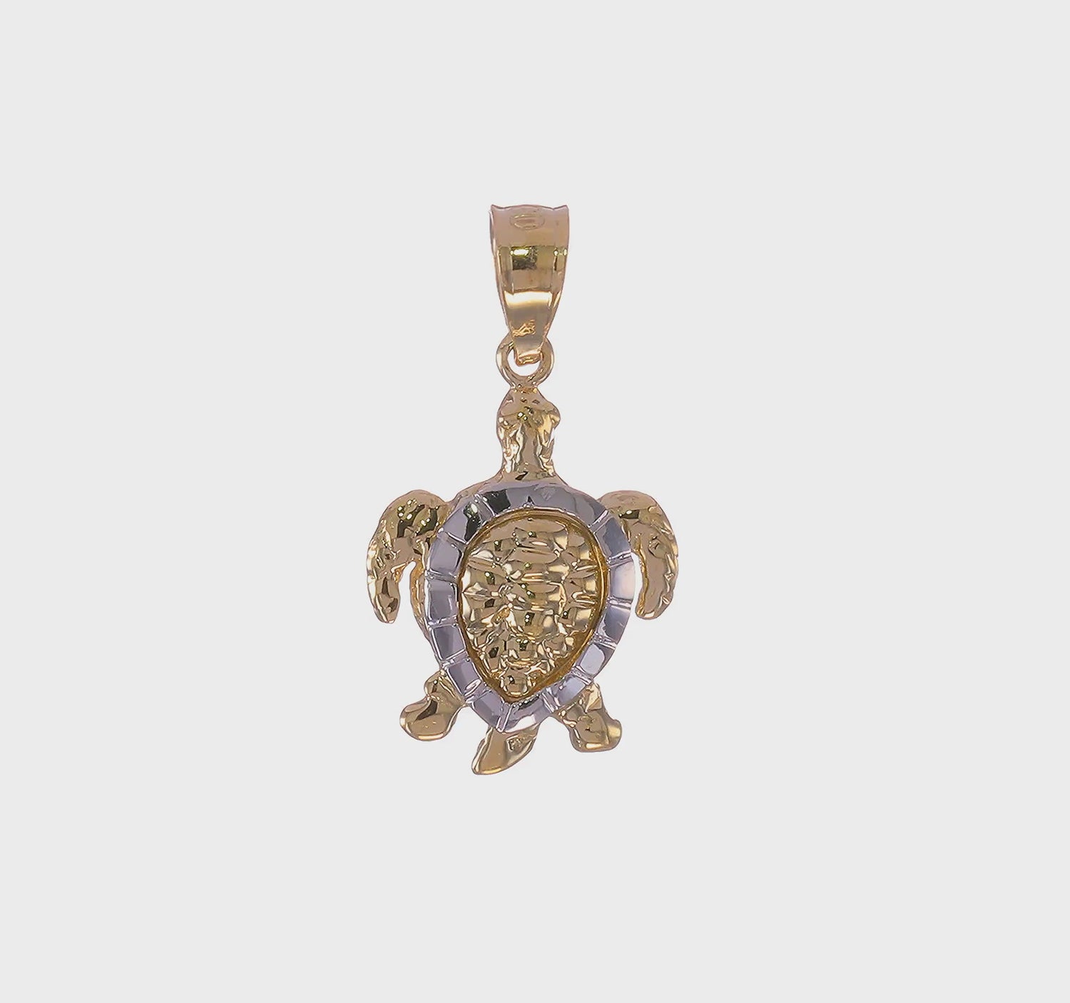 This exquisite 14K two-tone gold turtle charm combines yellow and white gold in a sophisticated design. Measuring 20mm in length and 12mm in width, the charm features a textured, polished finish that catches light beautifully. The solid construction ensures durability, while the 5mm bail accommodates most standard chains and bracelets. Weighing approximately 1.63 grams, this casted charm showcases fine craftsmanship with its detailed surface texture. An elegant addition to any jewelry collection, this turtle pendant works as a standalone charm or layered piece for personalized style.